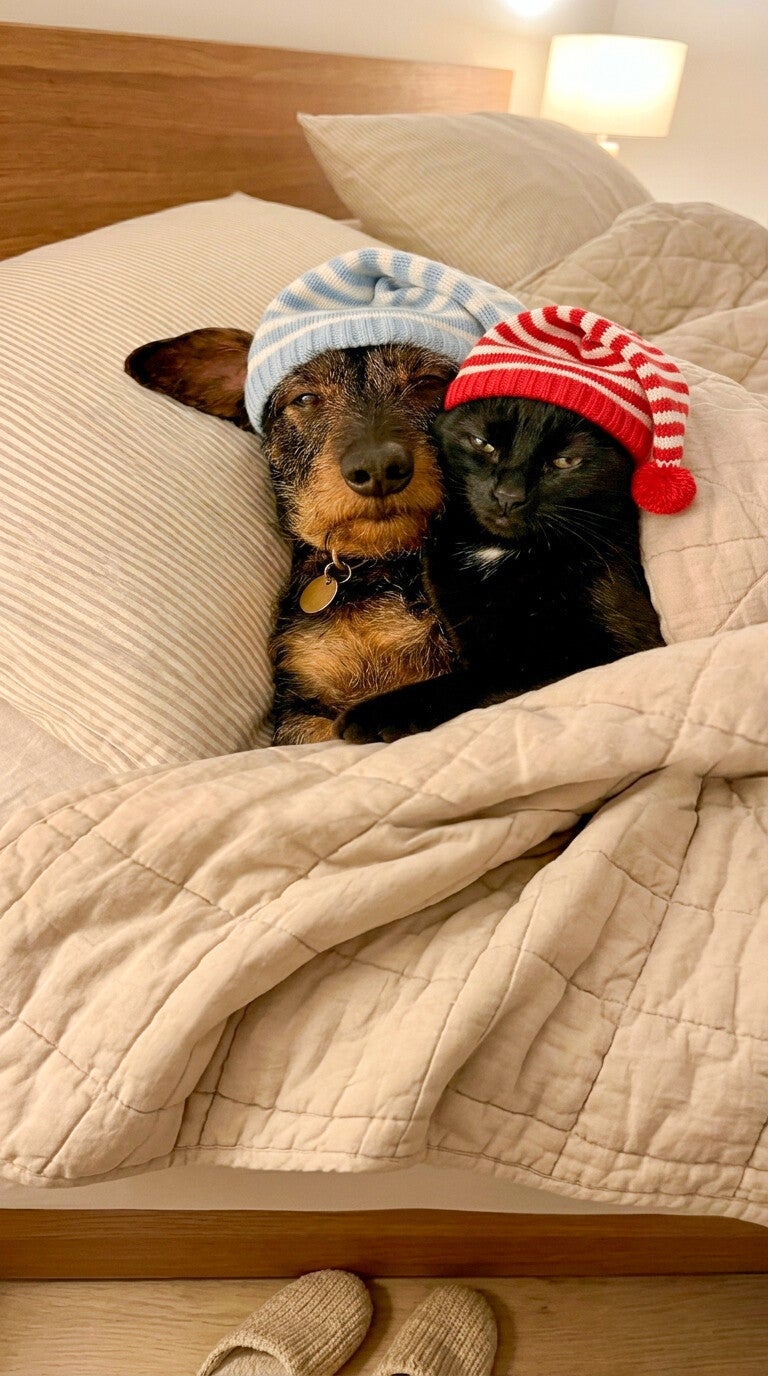 Laat ik vooropstellen: ik ben dol op mijn beesten. Maar mijn bed? Dat is mijn heilige tempel. Gereserveerd voor mij (en vooruit, voor Erik). Er is simpelweg geen plek voor een extra set snurkende longen, een vacht vol verrassingen en mysterieuze vlekken. Eén snurker naast me vind ik wel genoeg, Erik doet al meer dan zijn best om het gemiddelde bos om te zagen 😉.