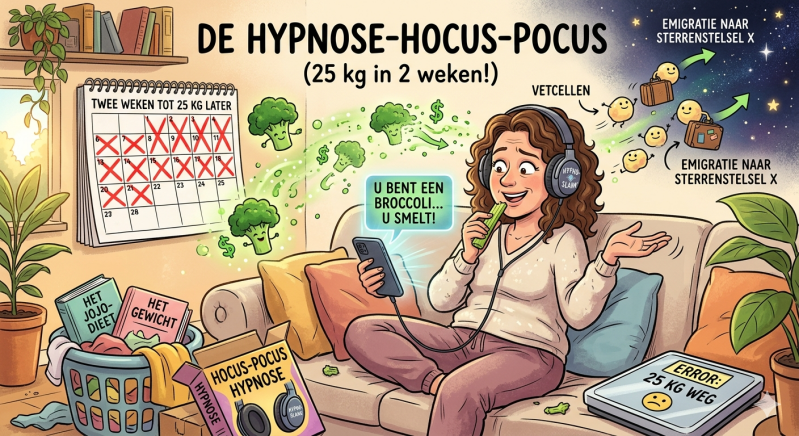 Hypnose zal best wel kunnen helpen om bijvoorbeeld minder te snoepen. Ik heb het even opgezocht, maar om 25 kilo vet kwijt te raken in 14 dagen moet je zo’n 175.000 calorieën verbranden. Daarvoor moet je 100 dagen non-stop wandelen zonder te eten. Je hersenen kunnen helemaal geen vetcellen verdampen door alleen maar naar een zweverige stem te luisteren.