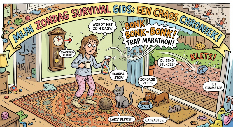 Eenmaal beneden, met wallen tot op mijn knieën, wachtte de eerste verrassing van de dag. Onze kat, Lars, heeft blijkbaar een heel specifiek talent: interieur-sabotage. In mijn huis ligt 40m² aan makkelijk afneembaar laminaat en PVC. Maar nee, Lars denkt: "Weet je wat dit hoogwaardige, wollen vloerkleed mist? Vier porties maaginhoud en een haarbal." Waarom is een kleed voor een kat altijd de officiële 'Kotstmat van Dienst'? Dus daar sta ik dan. 07.15 uur. Handschoenen aan, vlekkenreiniger in de aanslag. Gezellig hoor, die zondagrust.