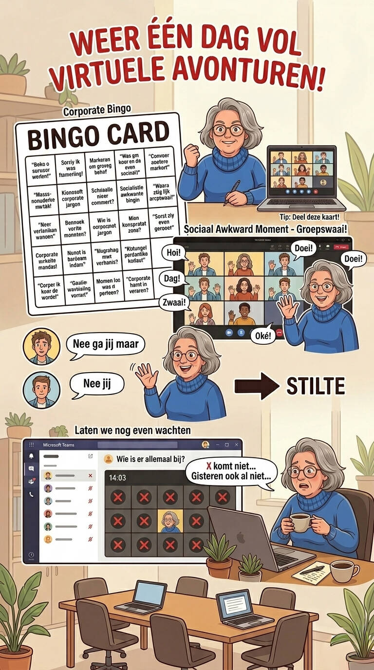 Na precies 180 seconden floept zijn gezicht in beeld, licht hijgend, alsof hij net een sprint heeft getrokken tussen twee virtuele vergaderzalen. En dan komt het: “Sorry, ik was nog even in een andere call.” Altijd dezelfde zin. Altijd dezelfde intonatie. En dan hebben we ook altijd nog die ene collega met slechte wifi, een echo of een camera die ineens een plafond filmt.